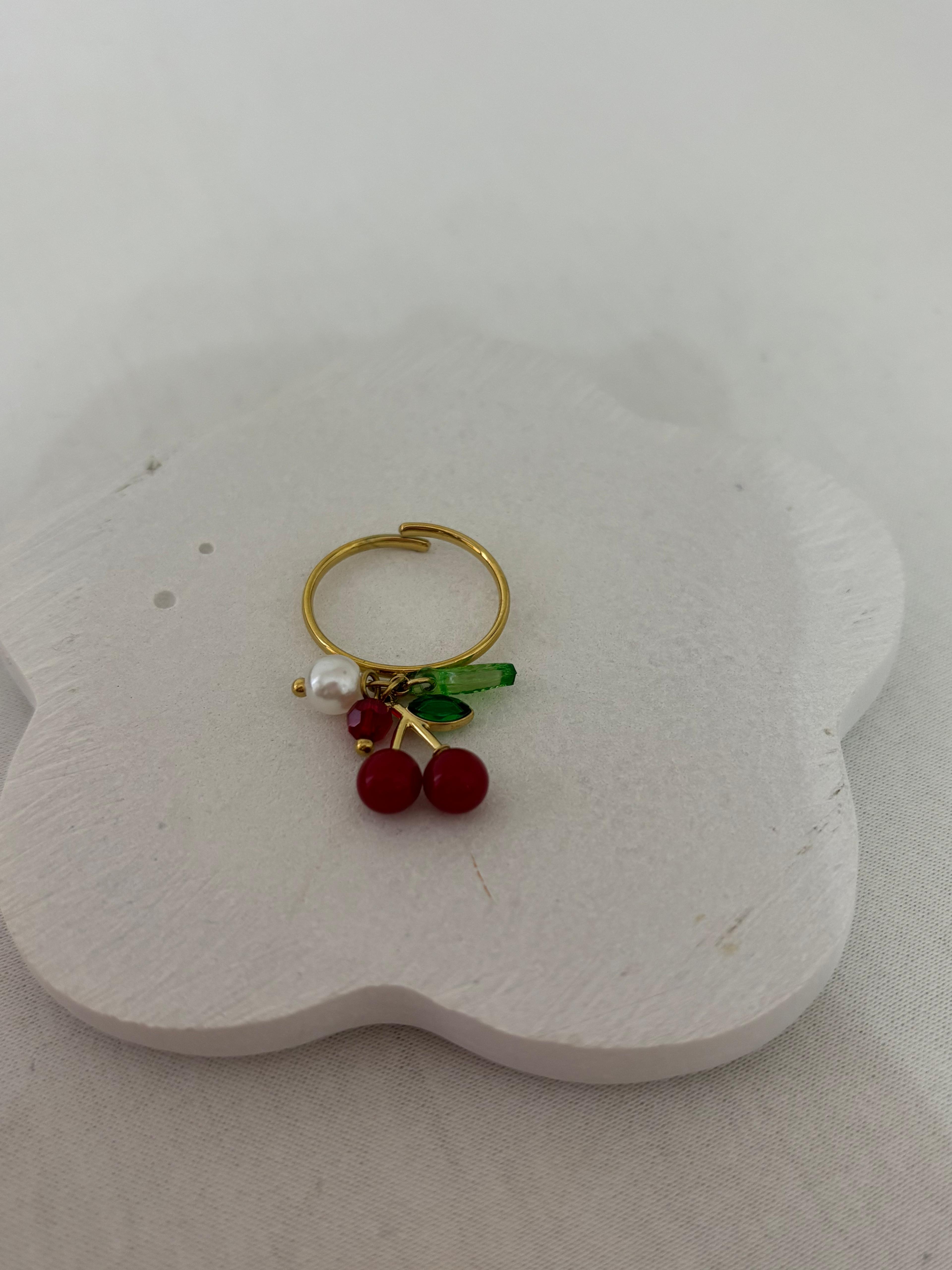 Un anello sottile e regolabile in acciaio dorato, decorato con charms giocosi: ciliegie smaltate, foglioline verdi, cristalli e una perla sintetica. Perfetto per aggiungere un tocco di dolcezza e colore al tuo outfit quotidiano.