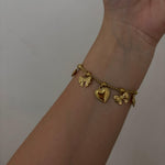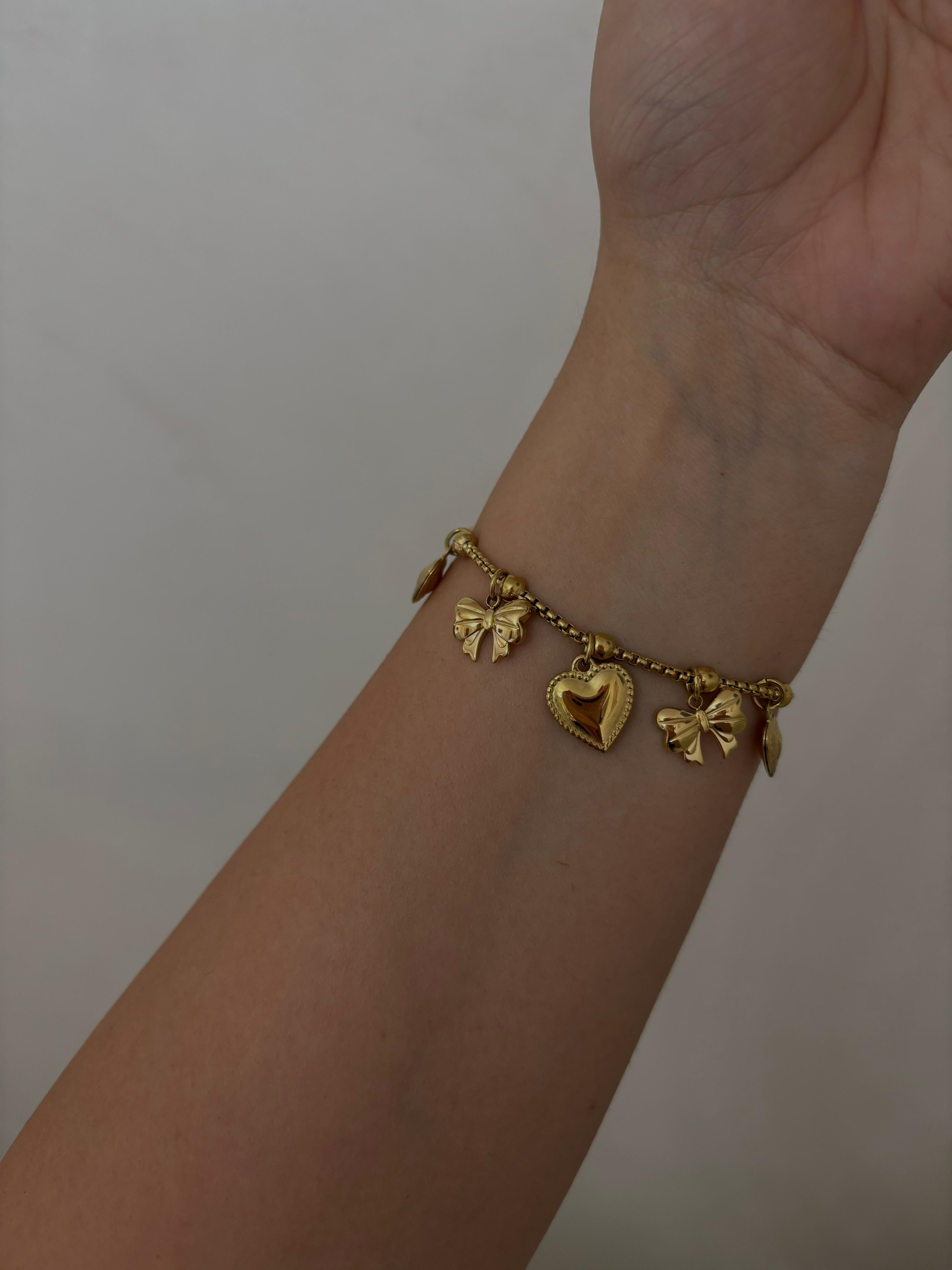 Bracciale in acciaio dorato con charms a cuore, fiocco e foglia tropicale: non scurisce, non scolorisce, lo metti e non lo togli più.
