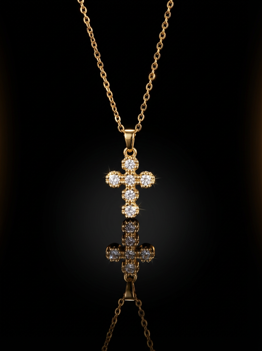 Una croce elegante e luminosa, interamente tempestata di zirconi rotondi che riflettono la luce in modo intenso e raffinato.
